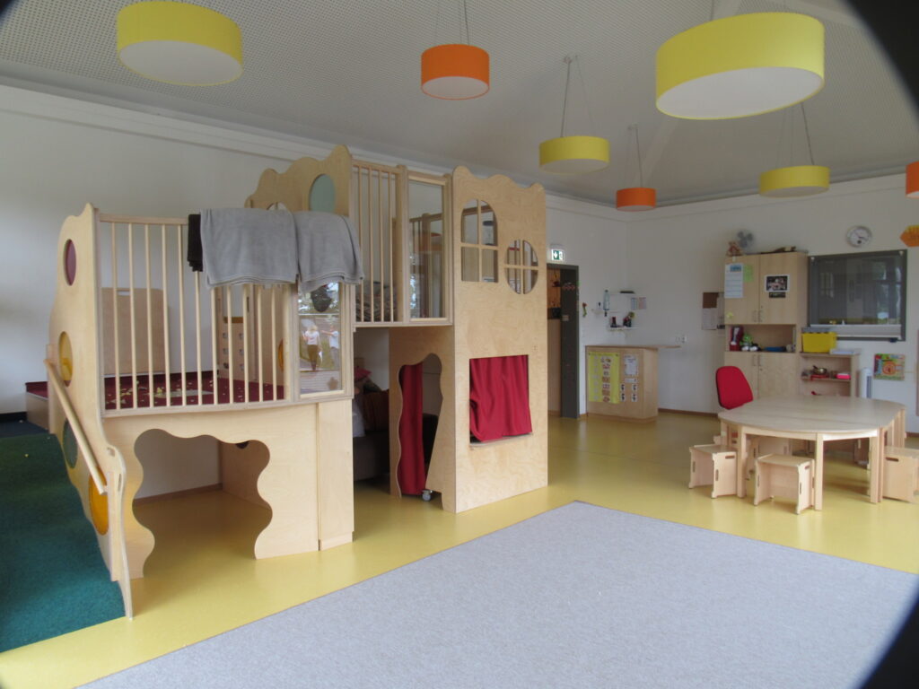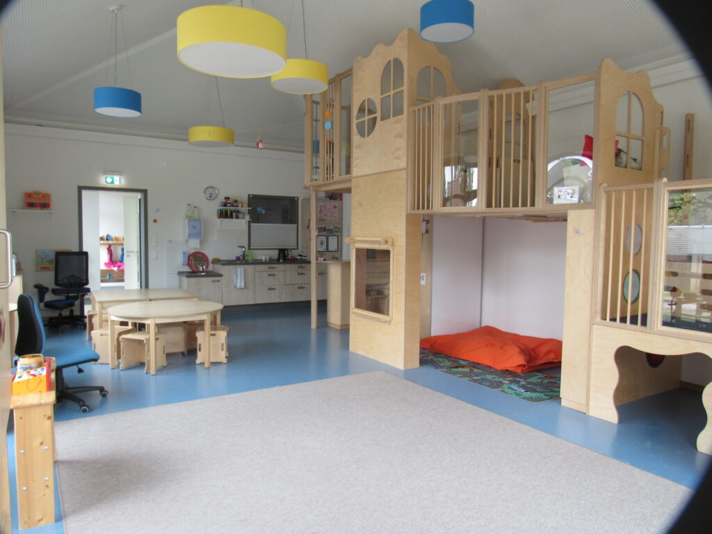 Die Hochebene im Gruppenraum bietet vielfältige Rückzugsmöglichkeiten, die gerade zwischen konzentrierten und vertieften Tätigkeiten zur Entspannung genutzt werden können.