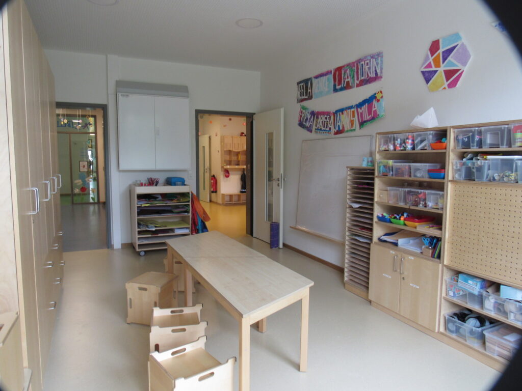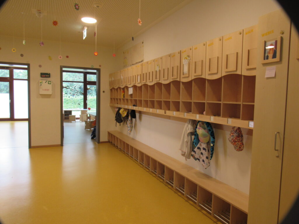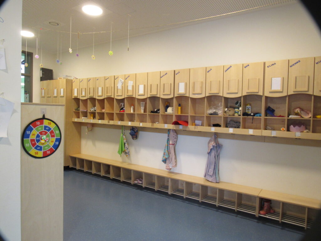 In diesem Bereich befinden sich die persönlichen Fächer aller Kinder dieser Gruppe. Die Bänke unterstützen das selbstständige An- und Ausziehen der Kinder. Zudem bietet dieser einladende Bereich auch anhand der Kreativfächer der Kinder einen Gesprächsanlass für Tür- und Angelgespräche mit den Eltern.